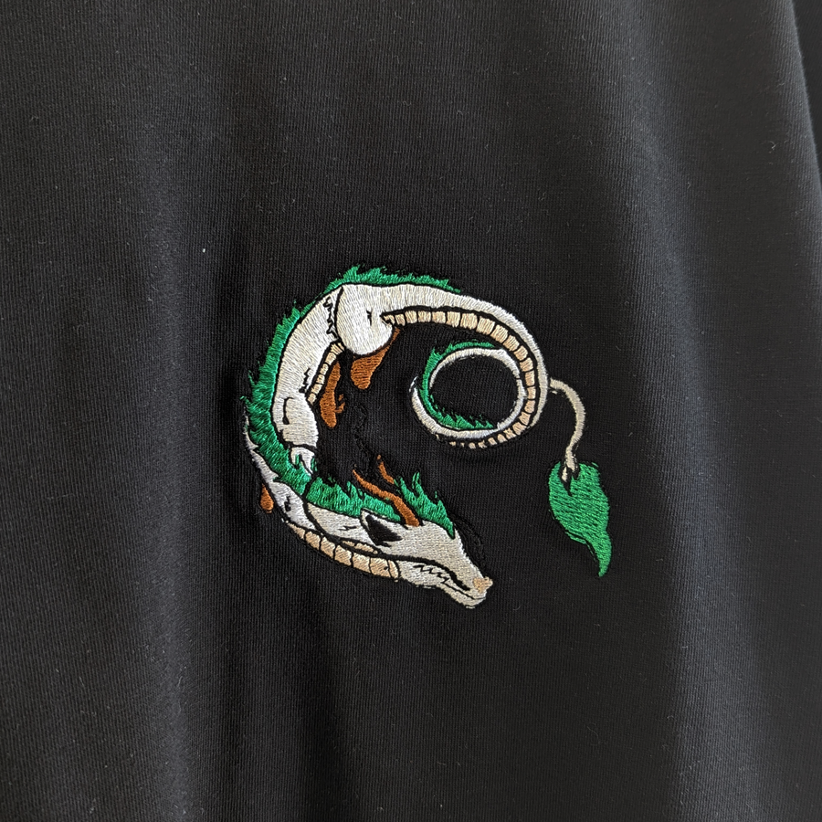 This T-Shirt features a small embroidered Haku Dragon design, from Studio Ghibli's Spirited Away, on the left of the chest. Our shirts come in either black or white.